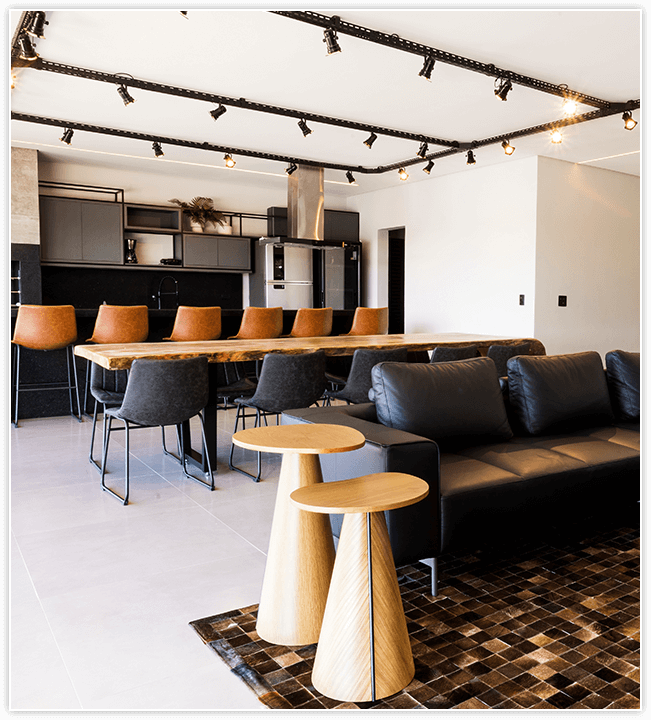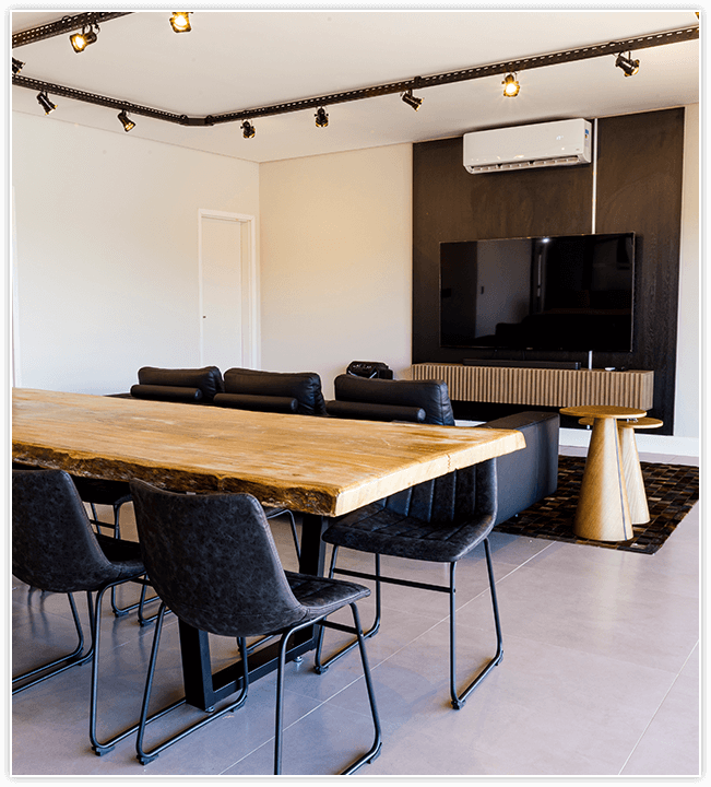 Sala unificada com área gourmet e acesso à piscina. Um espaço com vista incrível do lago, decorado com o conforto de um sofá de couro, TV de 70 polegadas e soundbar.