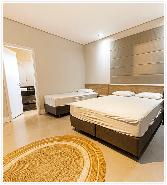 São quatro suítes climatizadas que acomodam tranquilamente quatro famílias. Cada suíte conta com uma cama queen e duas de solteiro, além de mesa de cabeceira, balcões e armários para guardar roupas e objetos.